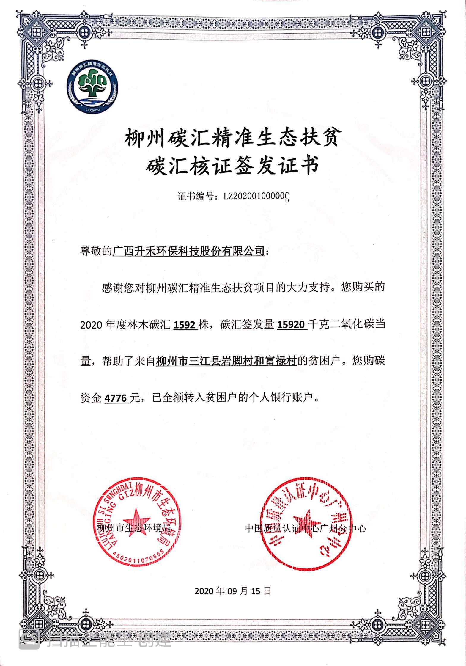 2020年9月15日,公司购买2020年林木碳汇1592株,购碳资金4776元,帮助三汇县岩脚村和富禄村的贫困户获柳州市生态环境局、中国质量认证中心广州分中心联合授予:“柳州碳汇精准生态扶贫碳汇核证签发证书”。